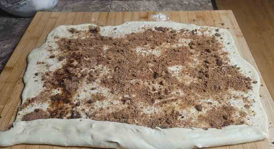 Roll out the dough into a large triangle. Brush the dough with butter and sprinkle on the filling.