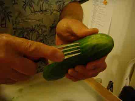 Peel the cucumber or cut part of the skin off. Here I am using a channel Cutter |