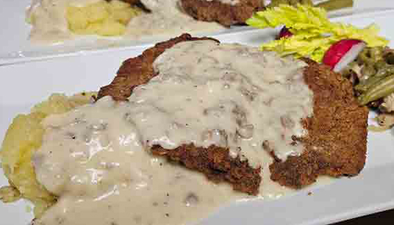 I love serving the Chicken Fried Schnitzel with mashed potatoes and green beans.