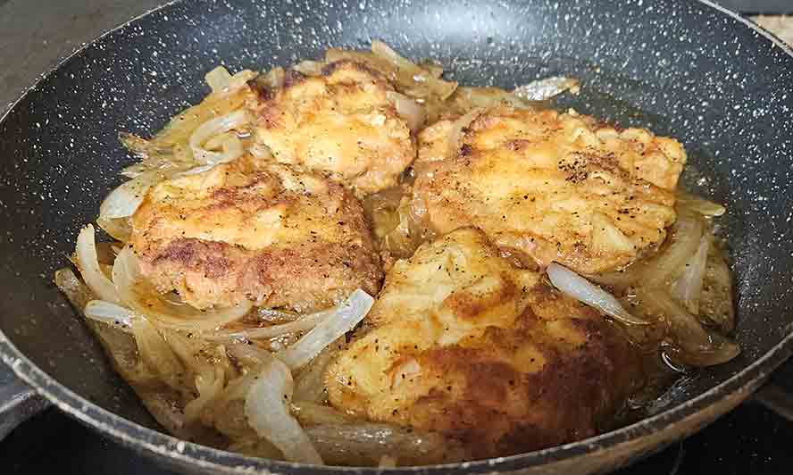 When the other side has browned add the sliced onions salt and pepper and put the Schnitzels on top.