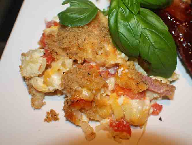 Spaetzle baked with Swiss cheese and topped with caramelized onion. |