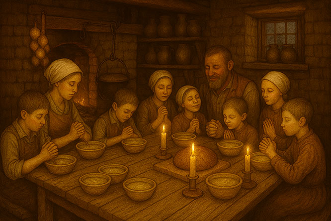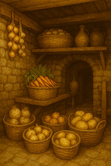 Then it is time to make the dinner, and vegetables are brought from the cellar and Split peas are scooped out of a sack from the harvest