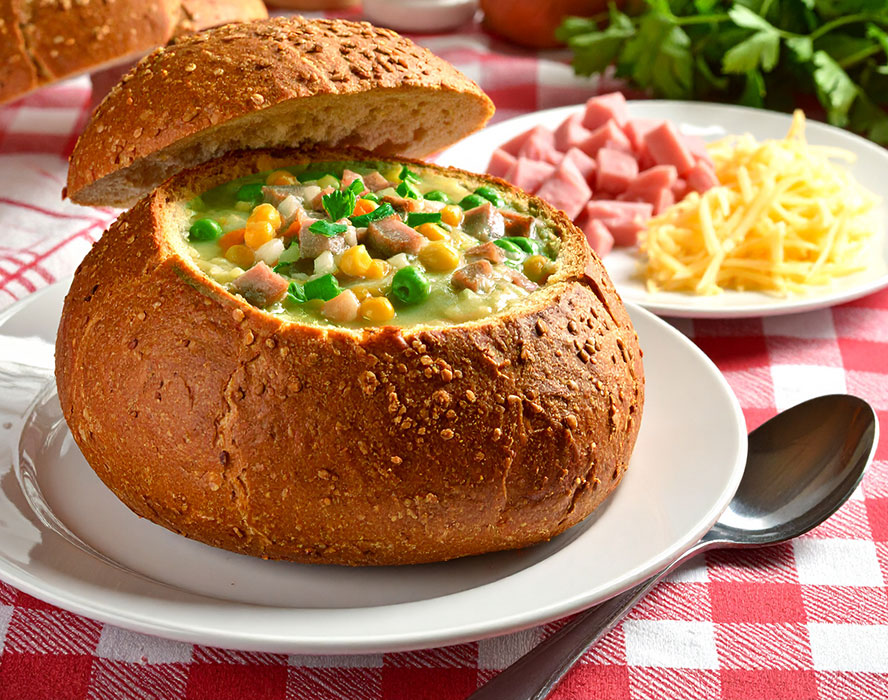 Pea Soup Anderson serves this in a bread bowl with toppings