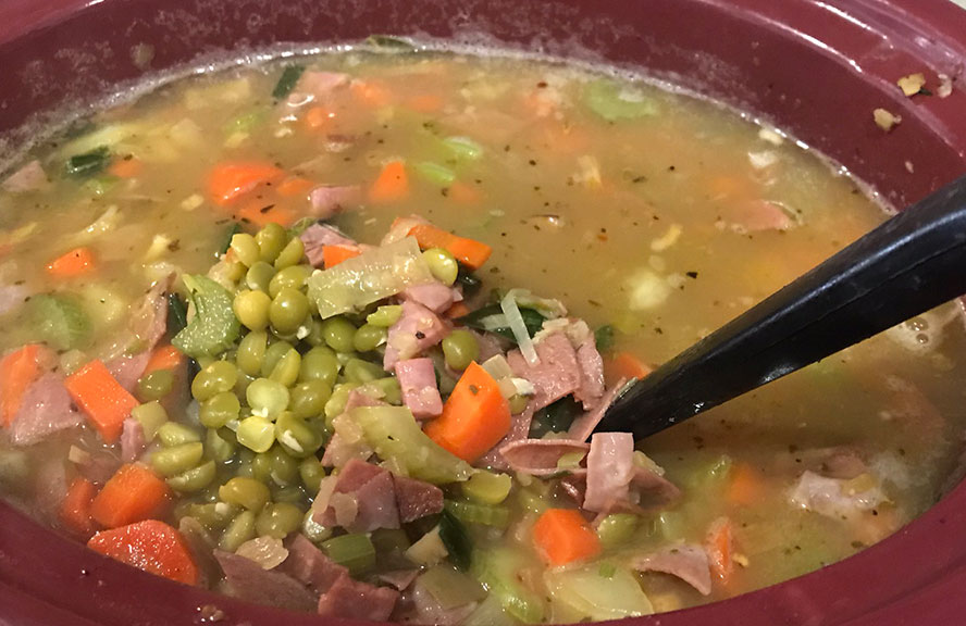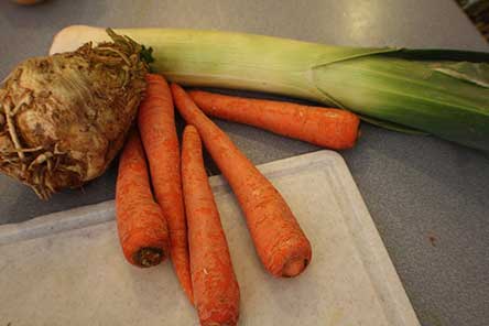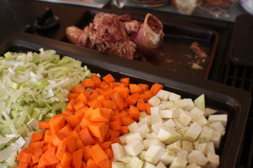 Bacon and root vegetables are brought up from the cellar and the soup is started.