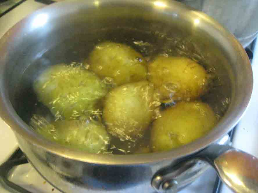 First, boil enough potatoes to make 1 cup of mashed potatoes.