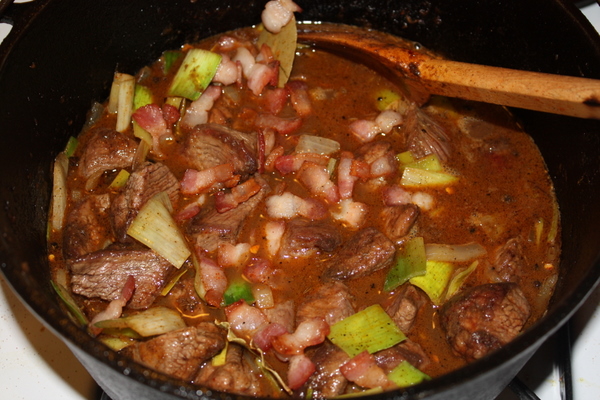 I am taking some cooking license here and using German ideas to create my own thing. The stew uses beer, paprika and caraway much like a Goulash and the Knoephla is a take on the German -Russian favorite Knoephla, and the Penn Dutch filling for Boova Schenkel.