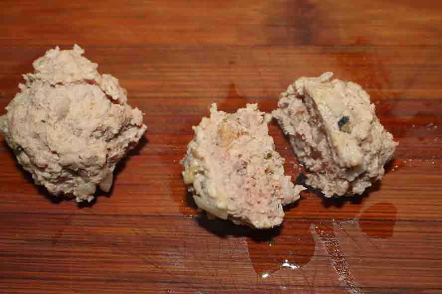 Testing the Klopse (meatball) for doneness.