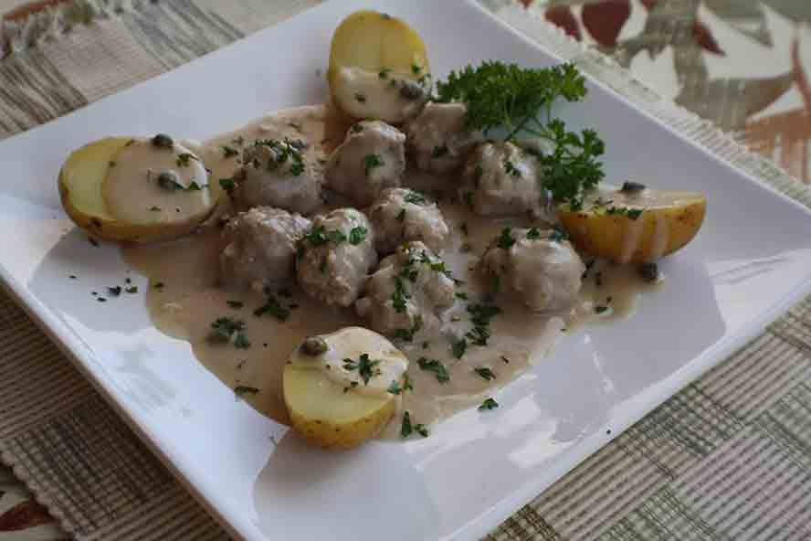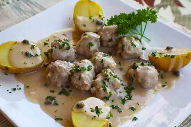 Traditionally Königsberger Klopse is traditionally served with boiled potatoes.