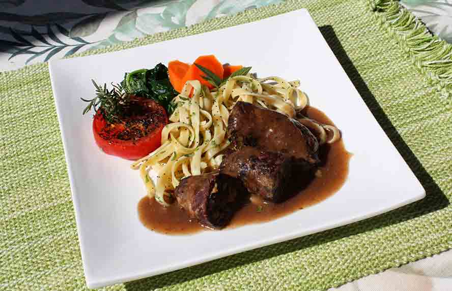 Then add the Rouladen back into the pan and simmer covered for about 1 and 1 /2 to 2 hours. The temperature should read about 200 degrees F. This will give you a fork tender Roulade.