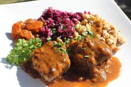 Cover the baking dish and keep in oven till time to serve. Sour cream or yogurt may be added. Rouladen are good served with Spaetzels, noodles, or mashed potatoes. |