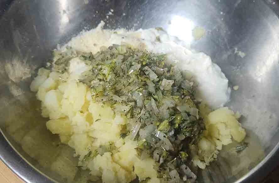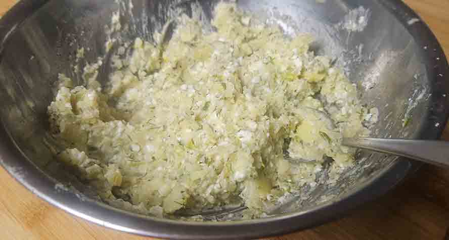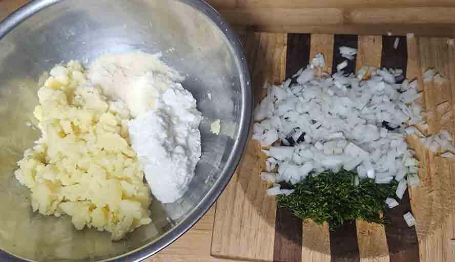 Mix the onions and dill with the potatoes and cheese.
