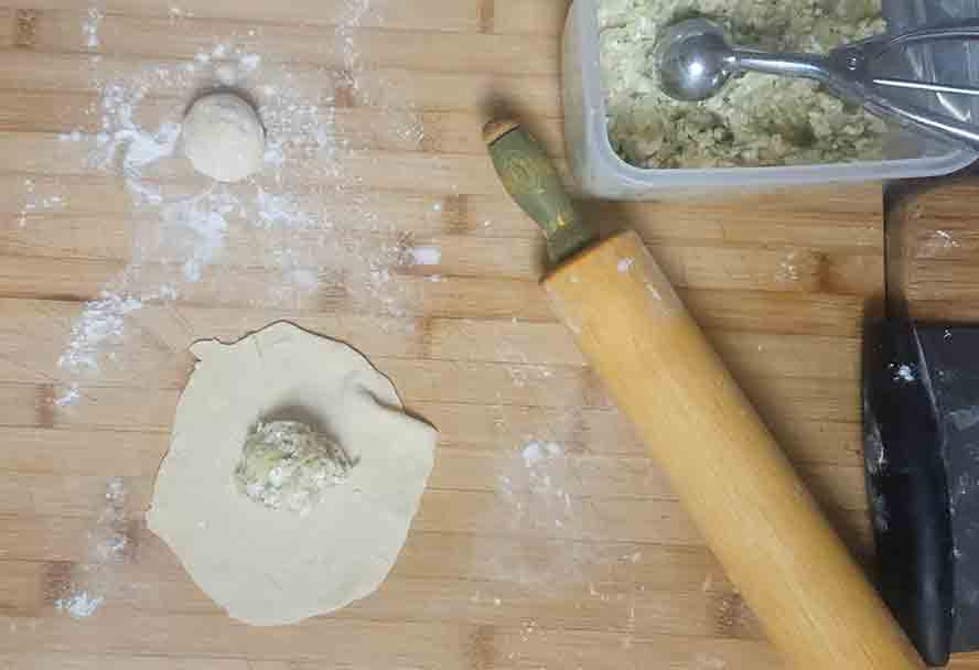 Put a small scoop of the potato mixture about the same size as the knob on the dough.