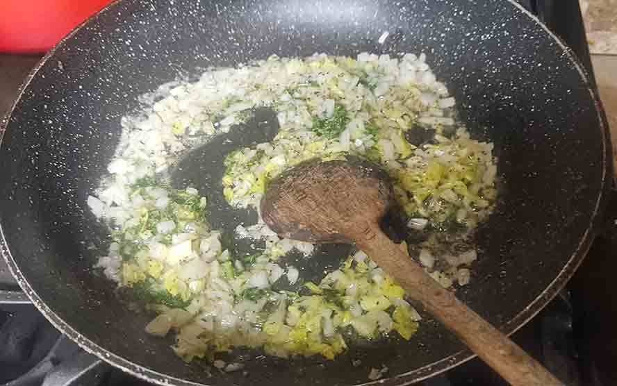 Leave the pan on the stove with the heat off. We are going to use it to saute the Boova Shenkels.
