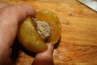 Take a ball of dough the size of a ball that is a bit smaller than a tennis ball. Flatten out the dough and wrap it around the plum and seal the dough.