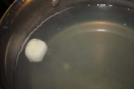 After about 10 -15 minutes the dumplings will rise to the top. Cook them for about 5 minutes after the are floating. Then carefully lift them out and put on a plate to cool down.