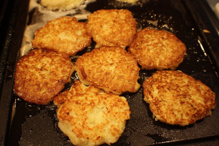 Heat your skillet with a good amount of oil and fry small spoonfulls (2-3 inch patties) of batter