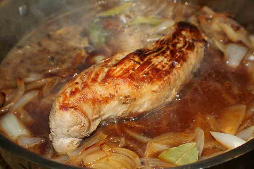 Dry the Tenderloin. Strain a cup of the marinade and reserve. Save 2 bay leaves.