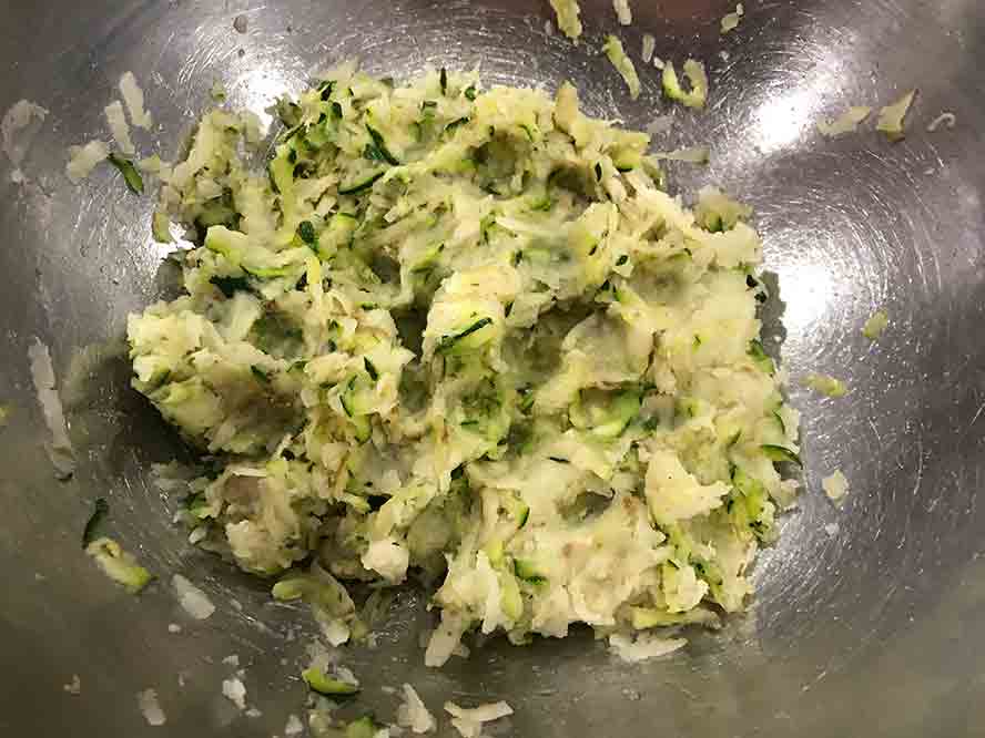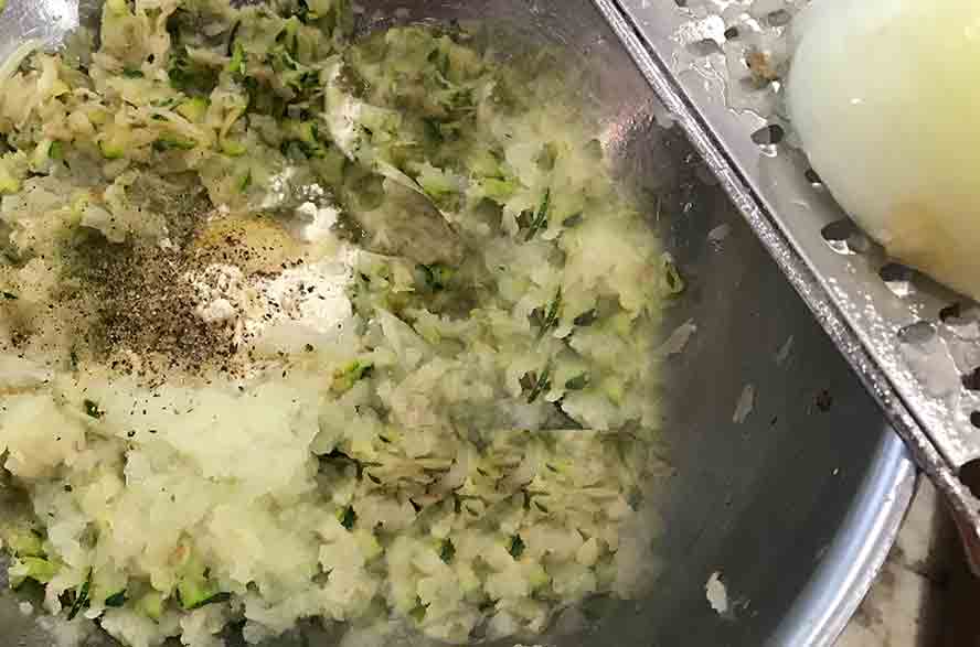 Grate the zucchini, lightly salt, squeeze excess water and add to the mix.