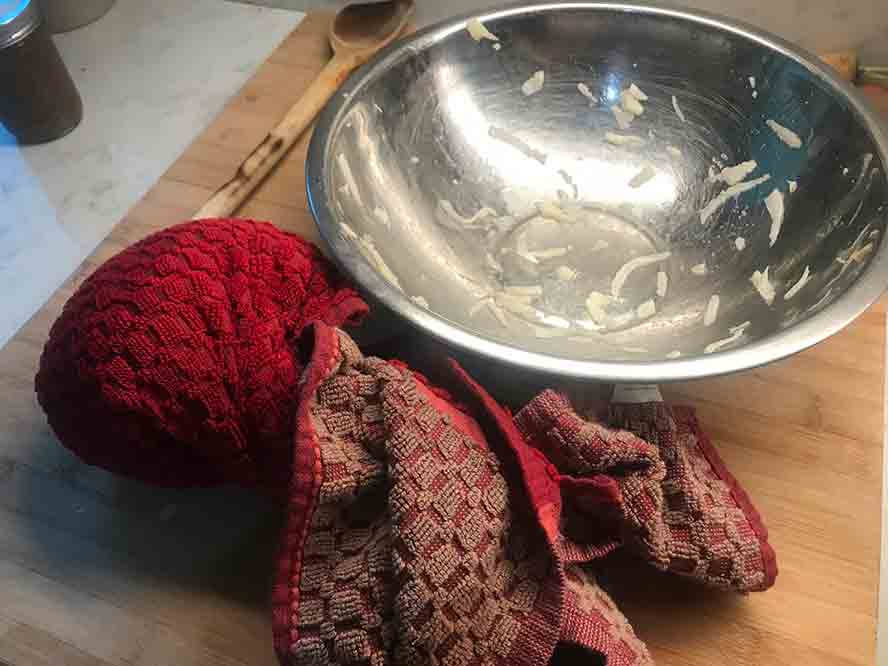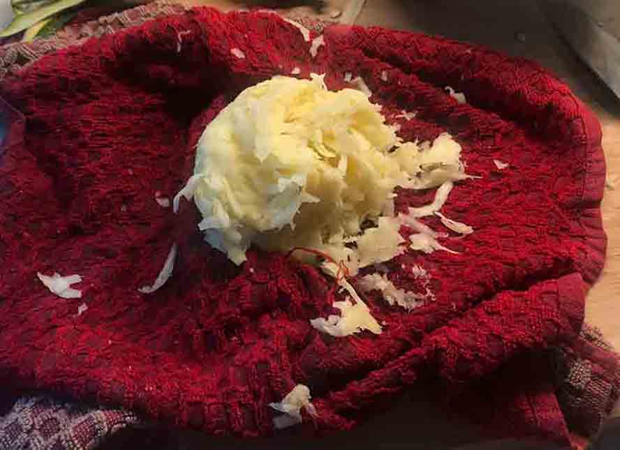 Drain the potatoes, and squeeze them through a towel to get out all the excess water.