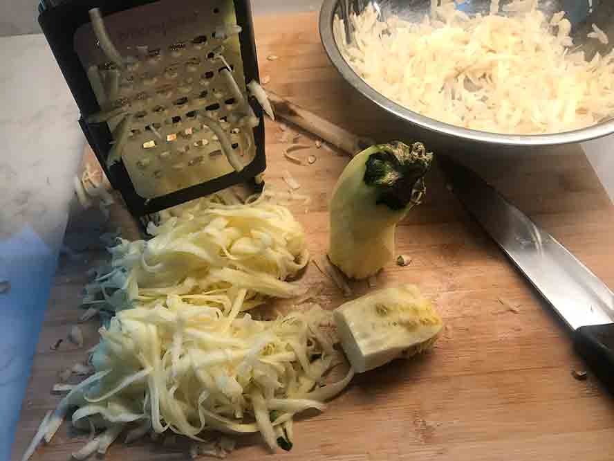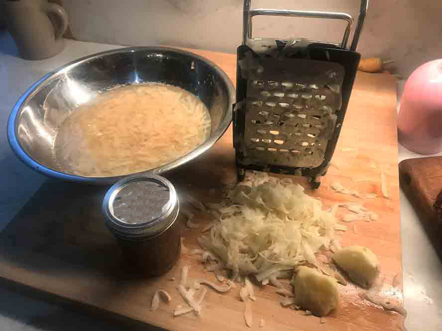Grate cooked potatoes on medium grater into the bowl for the batter