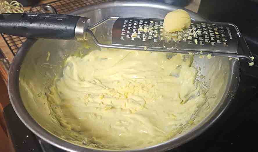 Then grate in the egg yolk,