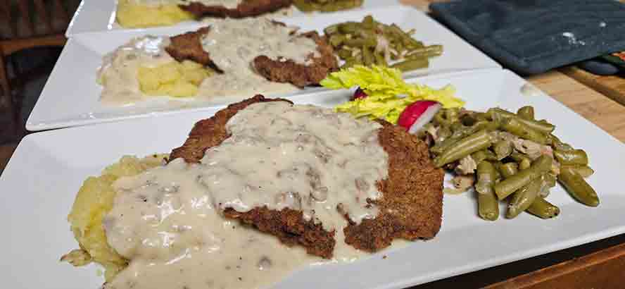 I love serving the Chicken Fried Schnitzel with mashed potatoes and green beans.