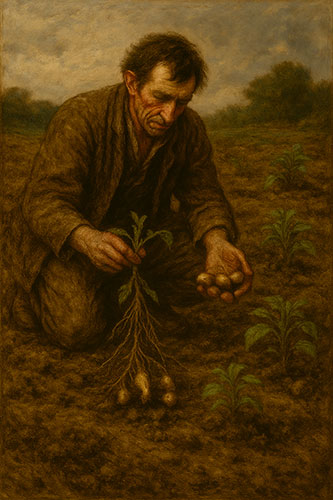 He knelt, dug into the cold earth, and unearthed a handful of knobby, dirt-covered tubers.